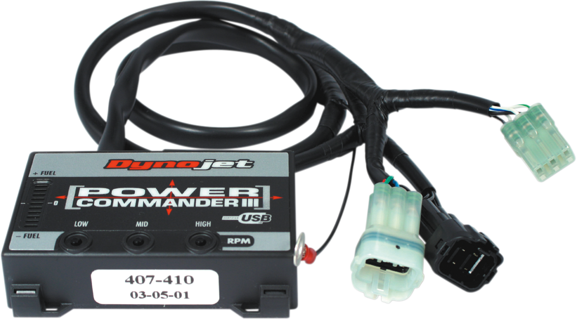 Each unit includes a built-in microprocessor and a specific map designed to improve engine performance over stock; Dynojet continuously maps new calibrations for each bike for downloading at their web site(www.powercommander.com), USB (Universal Serial Bus) port provides an instant and automatic connection to the Power Commander Control Center software; simply power up the unit and connect the PCIII USB to the computer with the supplied cable, Provides precise information for fine-tuning a fuel-injected motorcycle when changing an air filter, installing a new exhaust system or doing additional engine performance modifications, Direct injector control technology manages the fuel curve on models that do not have the sensors to monitor fuel adjustment, OEM-style wiring connectors with improved harness protection are supplied; no wiring modifications required, If you do not have a computer, you can change the settings with three touch buttons on the faceplate, Features an expansion port for future add-on modules from Dynojet, Software is compatible with Windows 2000/XP/Vista and Windows 7, USB special cable and 9V battery power adapter are included, Includes easy-to-follow instructions, Made in the U.S.A.
