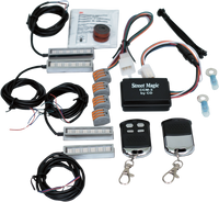 All Magical Wizard kits include a wiring diagram, complete installation kit and standard or Bluetooth-compatible (Android and IOS applications) Color Command* 5 remote control, Remote allows user to select one of seven pre-programmed colors, pick a custom color or continuously rotate through all the colors at a user-selected speed and select one of three breathe speeds or one of three strobe patterns, All Magical Wizard accent lights are pre-taped with 3M double-sided tape and have minimum of 60" of wire; Magical Wheel lights have 84" of wire, Starter kit includes four LED pods, Magical Wizard lights work great under saddlebags and on frame rails as ground effect, Wheel lights offer 12 LEDs in an oval disk shape that gives a 360? light output when mounted to the back side of a flat brake caliper with a minimum of 5/8" clearance between the wheel and caliper, Magical Wizard pods, strips and wheel lights can be used in conjunction with any Magical Wizard kit