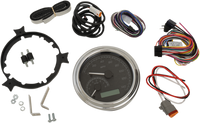 Has 140 mph speedometer, tachometer, odometer, dual resettable trip meters, and full indicator light complement (turn signal, high beam, neutral, low oil pressure) in one stylish gauge, 8,000 rpm tachometer has adjustable shift point and can display in digital numeric readout, Resettable miles to service with a warning (user settable countdown) and hour meter, Clock function (12-hour format), Voltage readout with low-voltage alert, Cylinder head temperature sensor (if bike is equipped with factory sender unit), Oil pressure warning light sold separately - see Related Products, Seven-speed gear position indicator, compatible with 3- to 7-speed transmissions, Security system indicator, Automatic turn signal cancelling compatible, Wait to start/check engine light function, Can perform performance calculations such as 0-60 time, top speed and peak rpm recall, 1/4 mile time and speed, Wiring installation is cut/splice; not a direct plug-in gauge, Case diameter measures 4-1/4" and bezel diameter of 4-5/8"