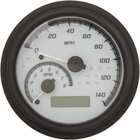 Has 140 mph speedometer, tachometer, odometer, dual resettable trip meters, and full indicator light complement (turn signal, high beam, neutral, low oil pressure) in one stylish gauge, 8,000 rpm tachometer has adjustable shift point and can display in digital numeric readout, Resettable miles to service with a warning (user settable countdown) and hour meter, Clock function (12-hour format), Voltage readout with low-voltage alert, Cylinder head temperature sensor (if bike is equipped with factory sender unit), Oil pressure warning light sold separately - see Related Products, Seven-speed gear position indicator, compatible with 3- to 7-speed transmissions, Security system indicator, Automatic turn signal cancelling compatible, Wait to start/check engine light function, Can perform performance calculations such as 0-60 time, top speed and peak rpm recall, 1/4 mile time and speed, Wiring installation is cut/splice; not a direct plug-in gauge, Case diameter measures 4-1/4" and bezel diameter of 4-5/8"