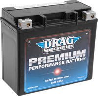 AGM (Absorbed Glass Mat) separators with superior grid and component designs allow Drag Specialties to offer one of the most powerful batteries in the industry, Improved charge recover capability from a deeply discharged condition, Longer shelf life, Improved life cycle performance, Extreme vibration resistance, Factory-activated, spill-proof design, Upgrade for customized motorcycles requiring the best performance, Made in the U.S.A.