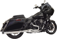 Developed in conjunction with Chris Rivas to develop the right system to address M-Eight big motor builds , Features equal-length stepped headpipes from 1-3/4" into 2" and then 2-1/8", 4" muffler housing has 3" louvered removable baffle, Includes full heat shields, billet end cap, 18 mm O2 bung and 12 mm adapters, Recommended for bikes with motor builds above 140 horsepower