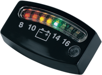 Lets you know if your motorcycle's charging system is working with just a glance, Green LED indicates normal operating range of 12.5 to 14.5V, Amber LED warns the bike is not charging, If reading drops below 10V or exceeds 15V, flashing red LED alerts the rider, Simple two-wire connection, Gauge measures approximately 2" L x 3/4" W x 3/16" H; daylight sensor automatically adjusts LED brightness