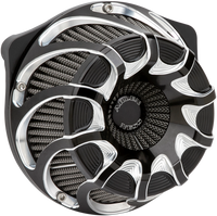 Black stainless steel jacketed inverted filters feature an inverted pleated top and 360° of pleated sides to pull in filtered air from every angle, Forged billet aluminum backing plate features patented Big Sucker™ hidden breather technology and a radius air inlet for smooth airflow, Forged billet air filter covers feature exposed design and a CNC inverted top that acts as a velocity stack to help pull in more air flow, Hidden breathers are o-ringed at the heads and exits at throttle body/carb to create a virtually closed-loop system, Performance filters features a black synthetic filter element wrapped in a stainless steel jacket, Filter is water resistant eliminating the need for a rain sock, CNC machined from forged billet aluminum, No external hoses or hardware needed, Made in the U.S.A.