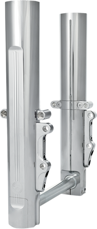 Artfully sculpted from heat-treated billet aluminum, Machined PM icon logo with a pin-stripe detail that extends the length of the fork legs, and a hidden-axle design, Kits include axle, axle covers, left and right legs with caliper and fender mounts installed, Made in the U.S.A.