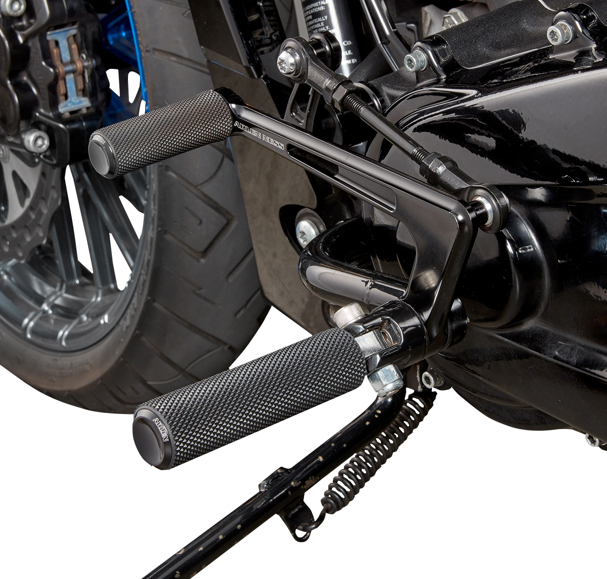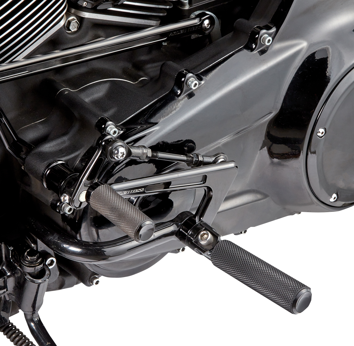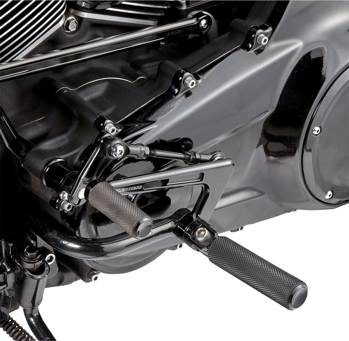 Custom Mid Control kit for Touring/Bagger models, Brings foot controls to a mid-control position, which increases ground clearance and puts the rider in a more aggressive riding position, Innovative control design utilizes factory foot control mounts on the frame, Using the factory foot control mounts instead of mounting to the engine allows for less vibration and in most cases eliminates the chance for engine case damage in the event of an accident, Mid control positioning is slightly more forward than standard mid control setups, providing aggressive riding position while maintaining comfort on longer rides, CNC machined billet aluminum control arm, Each control mount is made from CNC bent steel for durability and factory-like fit, Includes both brake and shift side foot control assemblies (no pegs or shift pegs included) , Accepts any male mount style footpegs or HD Big Twin shift/brake peg, Will work with stock exhaust