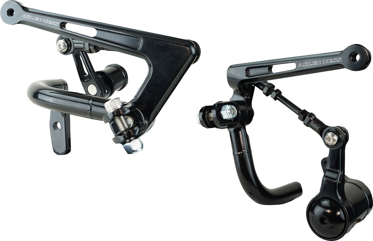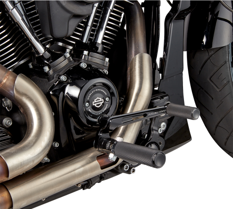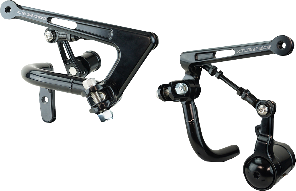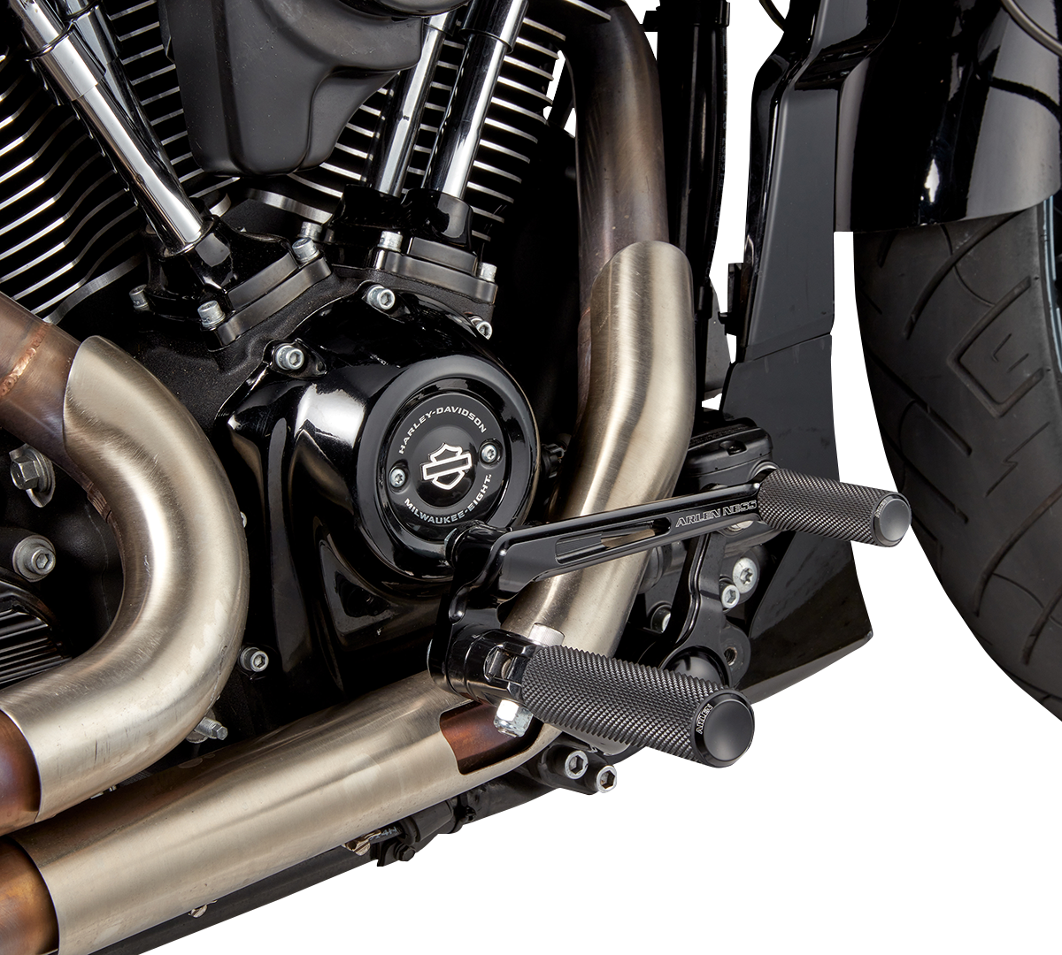 Custom Mid Control kit for Touring/Bagger models, Brings foot controls to a mid-control position, which increases ground clearance and puts the rider in a more aggressive riding position, Innovative control design utilizes factory foot control mounts on the frame, Using the factory foot control mounts instead of mounting to the engine allows for less vibration and in most cases eliminates the chance for engine case damage in the event of an accident, Mid control positioning is slightly more forward than standard mid control setups, providing aggressive riding position while maintaining comfort on longer rides, CNC machined billet aluminum control arm, Each control mount is made from CNC bent steel for durability and factory-like fit, Includes both brake and shift side foot control assemblies (no pegs or shift pegs included) , Accepts any male mount style footpegs or HD Big Twin shift/brake peg, Will work with stock exhaust