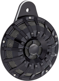 Custom Horn - 15 Spoke - Black - Big Twin Forged billet aluminum construction with stainless steel mesh screen, High-performance 110dB horn plugs into factory wiring