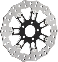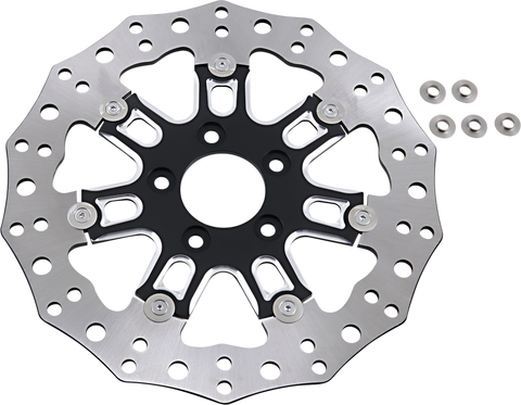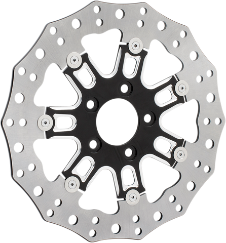 Front Rotor - 7 Valve - 11.8" - Black High performance floating brake rotors, 420 stainless steel outer band cut and drilled for optimum performance and heat dispersion, Inner carriers are CNC machined from aircraft quality billet aluminum