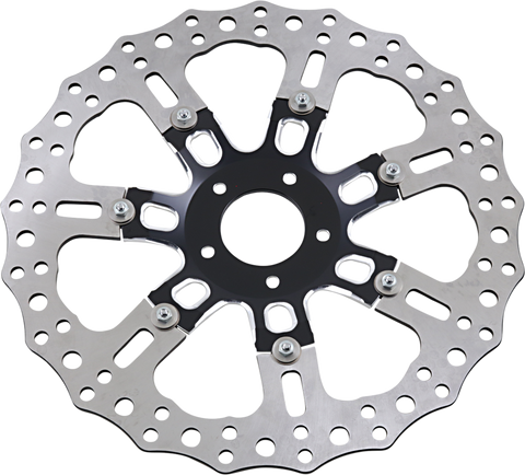 Front Rotor - 7 Valve - 14" - Black High performance floating brake rotors, 420 stainless steel outer band cut and drilled for optimum performance and heat dispersion, Inner carriers are CNC machined from aircraft quality billet aluminum