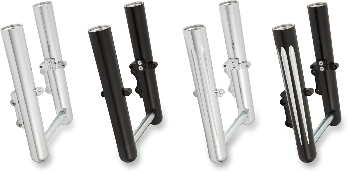 Hot Legs Fork Legs - Dual Disc - Deep Cut - Black - '00-'07 FLT CNC machined from billet aluminum, Features a tapered design with hidden axle, Dual-disc for touring applications, Accepts factory or aftermarket suspension internals