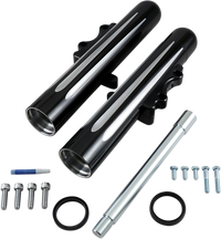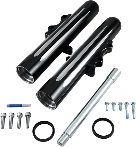Hot Legs Fork Legs - Dual Disc - Deep Cut - Black/Silver CNC machined from billet aluminum, Features a tapered design with hidden axle, Dual-disc for touring applications, Accepts factory or aftermarket suspension internals