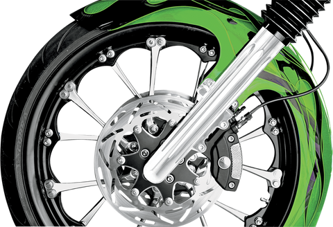 Hot Legs Fork Legs - Dual Disc - Deep Cut - Chrome - '08-'13 FLT CNC machined from billet aluminum, Features a tapered design with hidden axle, Dual-disc for touring applications, Accepts factory or aftermarket suspension internals