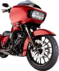 High performance floating brake rotors designed to enhance braking performance and style of factory wheels, 420 Stainless construction, drilled for optimum performance and heat dispersion, Accepts factory style brake rotor hardware, Made to endure the weight associated with V-Twin motorcycles