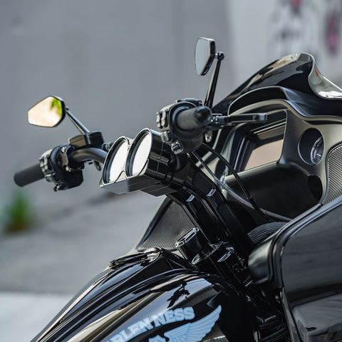Innovative design relocates factory gauges to the riser top clamp, which ensures a clear view of the navigation screen & your gauges