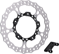 14* Big Brake rotor kits with a CNC machined billet inner carrier, Each kit drastically improves braking performance, upgrades the style, and provides an anodized color accent to your factory front wheel, Each 14* full floating rotor is constructed from 420 stainless steel outer disc that is drilled for optimum performance and a 6061-billet inner carrier, Billet brake caliper adapters are included in each kit to properly relocate your factory caliper to the proper position, Utilizes factory brake caliper, rotor hardware and brake hose, Easy bolt-on installation, no need to re-bleed the brake system, Each kit includes 14* rotor, caliper adapter bracket and all necessary hardware, Designed to fit HD FLT Touring models with factory wheels equipped with spoke mounted rotors