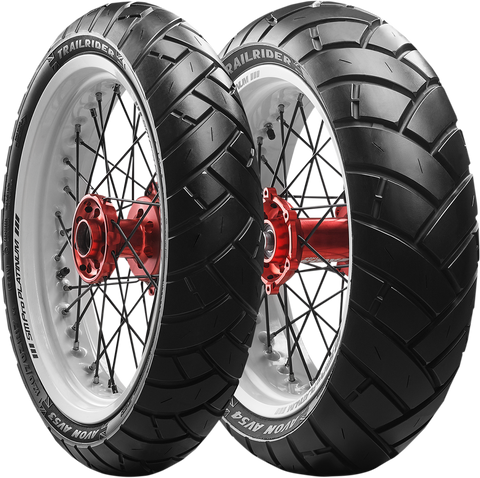 Three-dimensional diagonal interlocking tread sipes reinforce tire stability, restrict tire flex, and allow the tire to warm up quickly for responsive handling, Avon engineers developed a new super-rich silica compound using the latest technology to enhance wet grip without sacrificing mileage, Adventure sport tires that deliver a responsive ride and enhanced traction - both on and off the road, High-tech carcass construction and next generation compounds deliver superb grip and handling, Adventure sport tires 90% on 10% off, Tubeless (TL), Blackwall