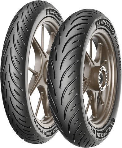 50% more wet grip than the previous generation - A compound mix incorporating Silica Rain Technology (SRT), an innovation which combined with a 26% void ratio gives 50% more wet grip than the previous generation, Increased cornering and straight-line stability than the previous generation - Thanks to its bias ply technology and bias casing supported by two crown plies the Michelin® Road Classic tire provides 50% more stability when cornering and 40% more straight-line stability than the previous generation, Tubeless (TL), Blackwall, In-house subjective comparison of the Michelin® Road Classic and Michelin® Pilot® Activ tires at maximum vehicle speed conducted on 6/22/2020 at the Ladoux track (France) with front dimension 100/90B19 and rear dimension 130/80B17 on a Triumph® Bonneville T100. Actual on-road results may vary., In-house comparison of the average wet lap times of the Michelin® Road Classic (1'02.81 seconds) and Michelin® Pilot® Activ (1'07.50 seconds) tires conducted on 6/16/2020 at Fontange track (1,2km) in France with front dimension 100/90B19 and rear dimension 130/80B17 on a Triumph® Bonneville T100. Actual on-road results may vary.