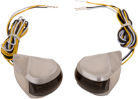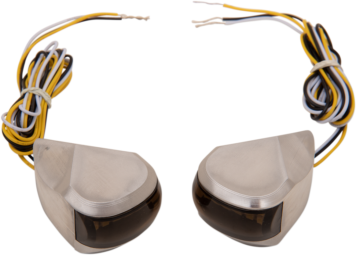 CNC-machined aluminum housings with dual-function LEDs potted in injection-molded smoked polycarbonate lenses, Will fit any H-D model with tear drop shaped standoff, American Made in house in Southern California