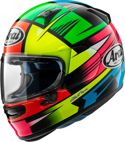 Features intermediate oval shape which fits the majority of head shapes in the North American markets, Quick, easy, and intuitive, the Variable Axis System (VAS) shield mechanism was developed to enhance the shape of the shell, The VAS latch captures and securely holds the shield closed to help prevent unexpected opening, Larger latch allows for intuitive and seamless shield operation, VAS pivot cover is smaller and lower, yielding more area above the cover, Smooth shell along the Snell test line in the temple area increases the helmet's ability to glance off objects during an impact, Peripherally Belted Complex Laminate Construction (PB-CLC) shell is developed to be both light and stronger, Adjustable perimeter liner and cheek pads allow owners to custom fit to their exact size requirement, Soft-brushed, removable liner allows for easy cleaning and provides incredible comfort, FCS® Cheek Pads — The contoured shape — combined with multiple layers of varying foam densities supported by a foam “spring” — cradles the face and helps block wind noise, One-piece exhaust vent improves exhaust performance and aerodynamic stability, Top exhaust vent remains open at all times, assisting with extraction of heat and aiding in relief of moisture build-up in the eye port area that can cause shield fogging, Shell flares 5 mm around the base, making it easier to get the helmet on and off yet remains secure with the FCS2 cheek pads, 2022 Arai Brochure