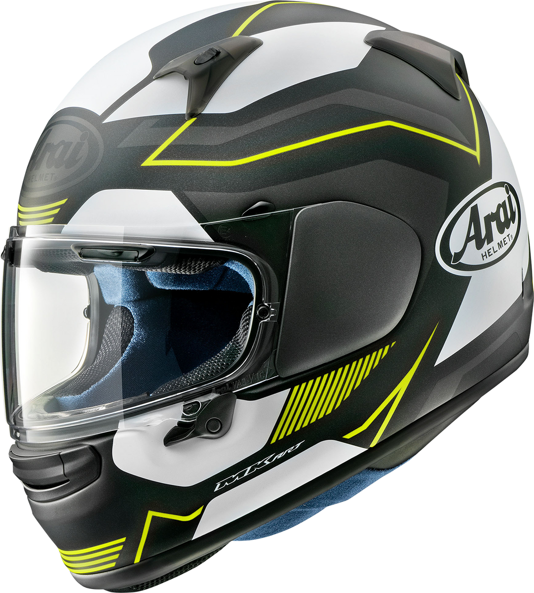 Features intermediate oval shape which fits the majority of head shapes in the North American markets, Quick, easy, and intuitive, the Variable Axis System (VAS) shield mechanism was developed to enhance the shape of the shell, The VAS latch captures and securely holds the shield closed to help prevent unexpected opening, Larger latch allows for intuitive and seamless shield operation, VAS pivot cover is smaller and lower, yielding more area above the cover, Smooth shell along the Snell test line in the temple area increases the helmet's ability to glance off objects during an impact, Peripherally Belted Complex Laminate Construction (PB-CLC) shell is developed to be both light and stronger, Adjustable perimeter liner and cheek pads allow owners to custom fit to their exact size requirement, Soft-brushed, removable liner allows for easy cleaning and provides incredible comfort, FCS® Cheek Pads — The contoured shape — combined with multiple layers of varying foam densities supported by a foam “spring” — cradles the face and helps block wind noise, One-piece exhaust vent improves exhaust performance and aerodynamic stability, Top exhaust vent remains open at all times, assisting with extraction of heat and aiding in relief of moisture build-up in the eye port area that can cause shield fogging, Shell flares 5 mm around the base, making it easier to get the helmet on and off yet remains secure with the FCS2 cheek pads, 2022 Arai Brochure