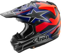 Features intermediate oval shape which fits the majority of head shapes in the North American markets, Consistently round and smooth shell, maintaining Glancing Off shape concept, Rounded chin bar maintains compact shell length resulting in less protrusion, leaving it less likely to catch and dig during a spill, Super Fiber provides 30% higher tensile strength than standard fiberglass and provides increased penetration resistance, Peripherally Belted Complex Laminate Construction (PB-CLC) shell, Chin bar vent grill installed on a rounded chin bar, mounted form the outside on the exterior vent cap and can be easily removed for cleaning or damage replacement—vent cap also designed to break way from the chin bar in event of impact, The Air-Through top-rear-duct center brace also functions as a goggle-strap locator, Diffusers can be removed or replaced quickly and easily by removing a single screw on the rear-duct center brace, Air outlets on the peak are made larger to compensate for increased lift and is made with durable, yet extremely flexible material, mounted with plastic screws designed to break on impact, so as to not snag on impact which could send energy into the helmet or cause excess rotational force, Emergency release cheek pad design allows trained medical personnel easier access to an injured rider, reducing the chance of unintentional injury, Removable neck roll allows easy and convenient cleaning of the helmet, 2022 Arai Brochure