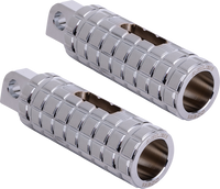 SpeedLiner footpegs feature an oversized 3D knurled billet design, Each peg is CNC machined from billet aluminum, Center cut out pocket adds style & added foot traction, Reduced length for increased ground clearance, Hollow cut out center for reduced weight, Matching floorboards, foot controls, grips & more are also available, Laser engraved Arlen Ness? logo, For standard male mount and M8 Softail? driver/passenger