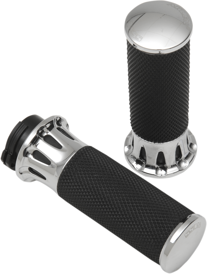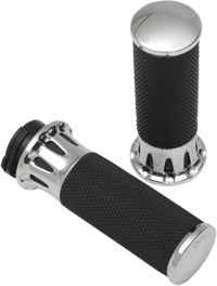 Each grip design features excellent traction for your hands, Billet aluminum accents are intricately machined, Features 1-1/4" billet aluminum inner collars, diamond knurled rubber grips and billet aluminum end caps, All grips come with throttle sleeve installed and include grip glue and simple to follow instructions, Matching footpegs and shifter pegs are available separately