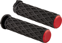 Diamond design rubber grips with integrated knurling inside each diamond shaped pocket for a vintage look with excellent hand traction , Premium rubber grip feels soft & comfortable feel in all riding scenarios, CNC-machined end caps for a finished look, Arlen Ness laser logo included on each end cap , Installs like factory grips; no glue required for installation