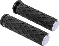Diamond design rubber grips with integrated knurling inside each diamond shaped pocket for a vintage look with excellent hand traction , Premium rubber grip feels soft & comfortable feel in all riding scenarios, CNC-machined end caps for a finished look, Arlen Ness laser logo included on each end cap , Installs like factory grips; no glue required for installation