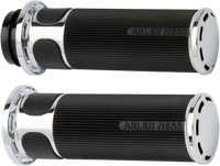 Each grip design features excellent traction for your hands, Billet aluminum accents are intricately machined and later finished in flawless chrome or black anodizing, Slot Track design features 1-1/4" billet aluminum inner collars with an air cushion rubber thumb pad, linear knurled rubber grips and slotted billet aluminum end caps, All grips come with throttle sleeve installed and include grip glue and simple to follow instructions, Matching footpegs and shifter pegs are available separately