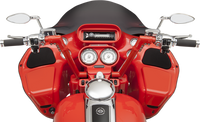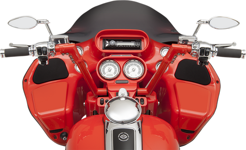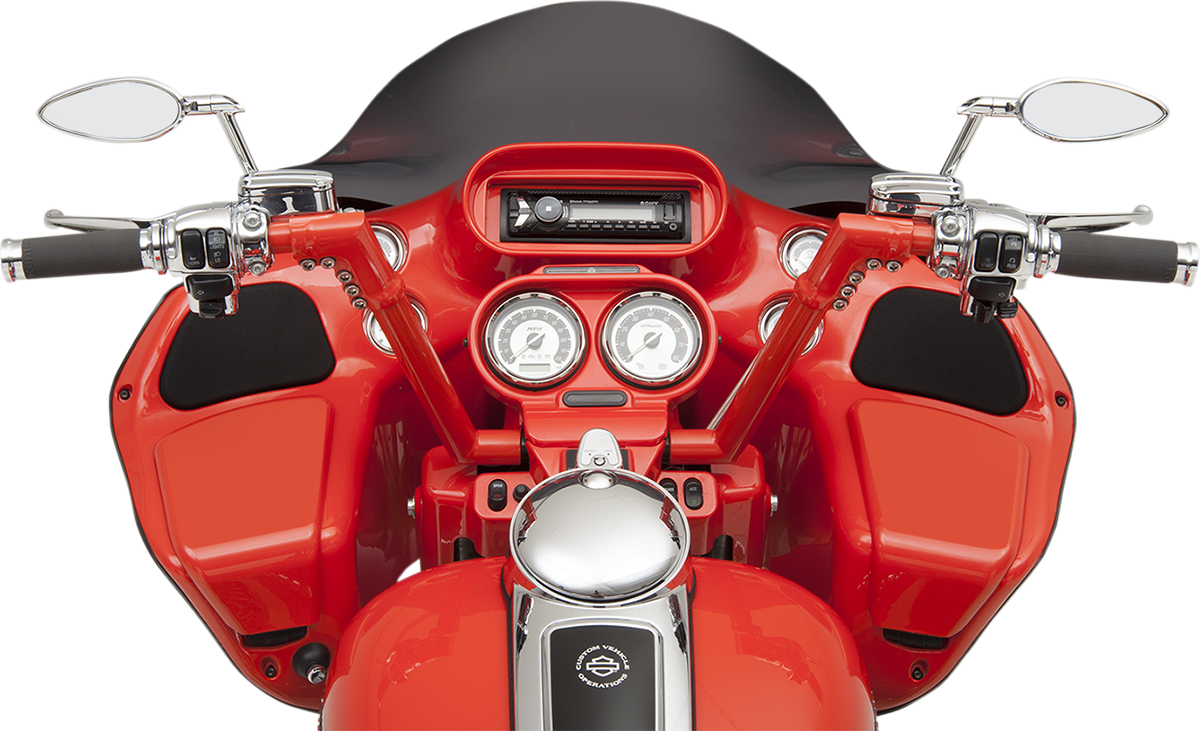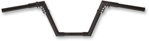 Steel handlebars with billet aluminum junction clamps, Junction clamps allow bars to rotate towards or away from rider as needed for comfort and can be removed for easy wire installation, All bars are drilled and slotted for internal wiring and can be used for cable or TBW (Throttle-By-Wire) applications, Mini Apes and Bagger Apes feature 3-1/2" on-center knurling