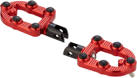 Ness MX foot pegs feature a lightweight cut through design with integrated rubber inserts resulting in a cut through design with excellent foot traction, CNC machined from billet aluminum, Each peg features CNC machined cuts on the top and side of the peg body for style that can be seen at every angle, Rubber inserts offer foot traction and protect the finish of the peg, inserts are replaceable, Foot peg mounts sold separately