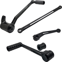 3D knurled billet design drastically enhances foot control styling while adding foot traction, CNC machined billet aluminum construction, Kit includes brake arm, shift rod, inner shift arm, & either a solo or heel/toe shifter with pegs, Shift rod features specially designed spherical bearings for an ultra-clean look, eliminating the need for heim joints