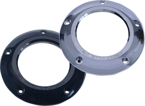Barnett Scorpion Series Clear Derby Covers feature a quarter inch thick, clear polycarbonate window to your clutch, Outer cover CNC machined from billet aluminum, Black powdercoat or Chrome finish, Viewing window is scratch and discoloration resistant, firmly secured in place and sealed with an O-ring gasket, Derby cover gasket included