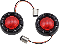 Replacements for OEM LED turn signals, Eight red LEDs embedded into an outer aluminum bezel and 12 red center LEDs, Outer ring LEDs function as a running light, 12 center LEDs function as a high intensity turn signal and brake light, DOT/SAE Compliant, For U.S. models with 1157 contact bases without center taillight (must have bullet-style (pop off) lens).