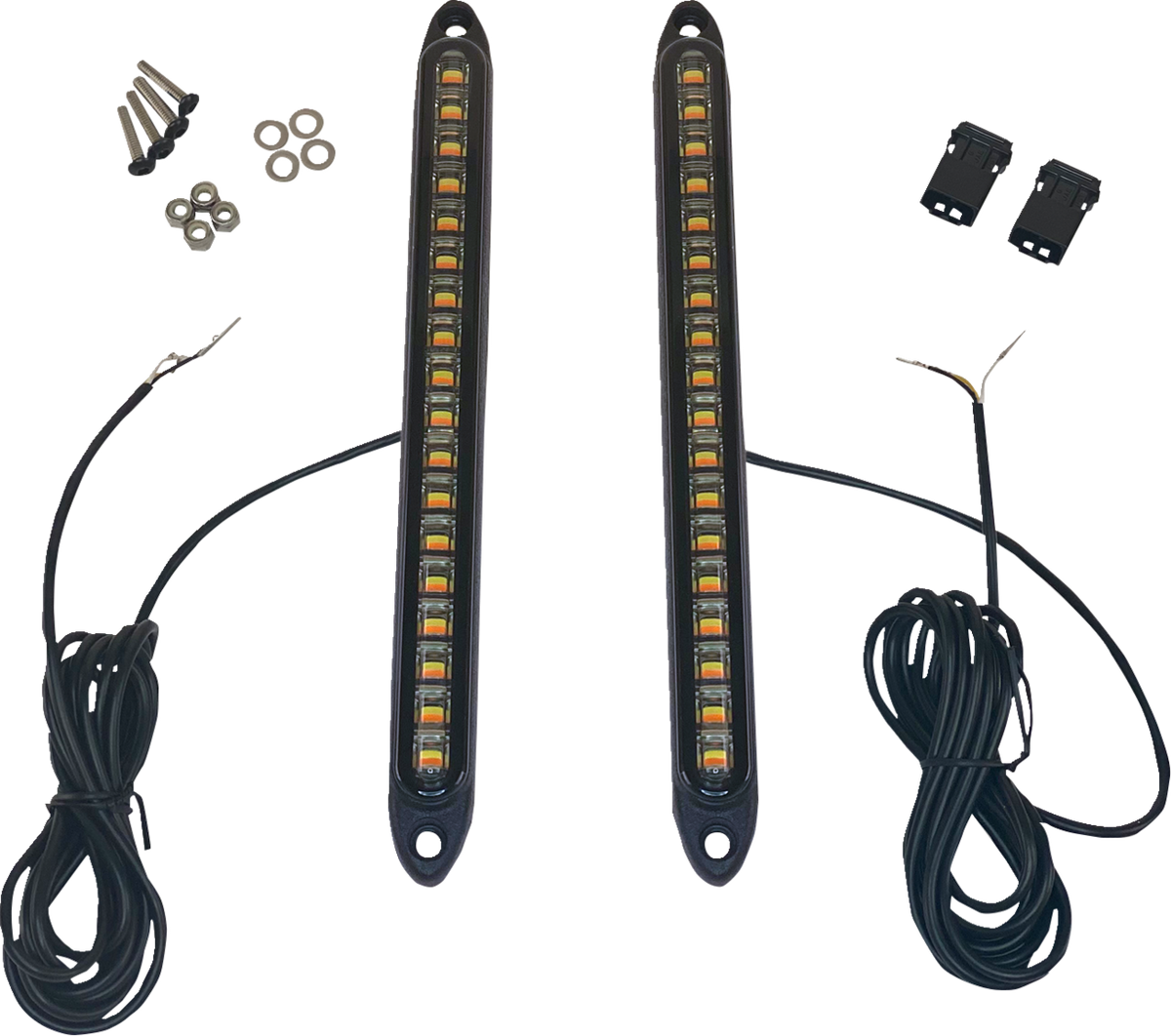 18 LEDs illuminate a bright white running light, then flash as an amber turn signal, When the turn signal is activated, the white light remains off to provide a full contrast left and right turn signals, Mounts to the vehicle with provided hardware, and also has double-sided tape for added security, 6' wire leads exit the back center of each unit and are pinned for use with provided quick connectors, With connectors installed, lights are plug and play with Custom Dynamics? SXS Turn Signal Module part # 2050-0449 and SXS Turn Signal Switch part # 2106-0582 (sold separately), Works on all 12 V DC systems