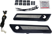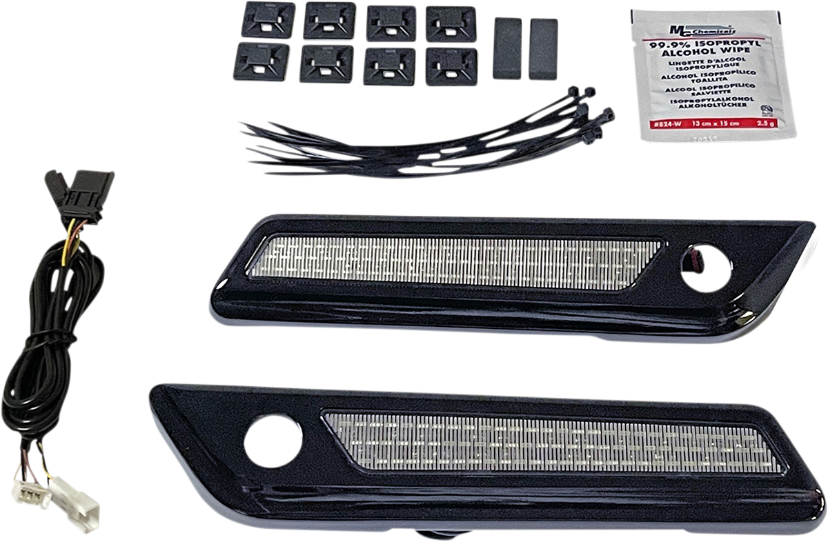 Latch Light - Saddlebag - Smoke - Black Dual intensity red LED replacement saddlebag latch, Red LEDs function as run/brake/turn or run/turn depending on model, Included wire harness allows for plug and play installation under the seat