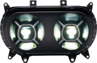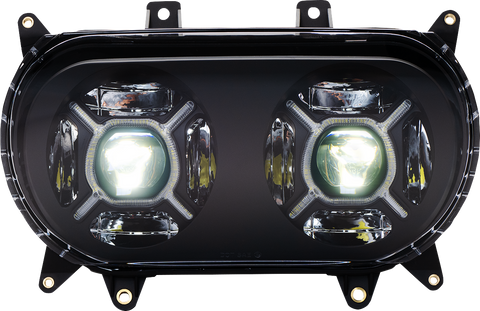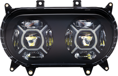 Double lamps within a completely sealed IP67 waterproof housing provide projection style low beam, Eight more LEDs utilize a reflective technology to produce a brilliant high beam pattern, Double-X pattern illuminates as white running light, Complete LED headlight assembly is a direct plug and play replacement for OEM Road Glide headlight, High Beam = 1654 lm, Low Beam = 698 lm, DOT & ECE compliant