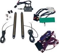 Complete plug and play kit includes amber/white front turn signals strips with white running light and amber turn signal, Turn signal flasher module, low profile turn signal switch, and SMART Triple Play? run, brake, turn conversion module to convert rear OEM taillights to run, brake and turn signals, 10 user selectable brake/strobe patterns, All components are equipped with watertight quick connectors to make installation simple and easy