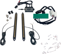 Complete plug and play kit includes amber/white front turn signals strips with white running light and amber turn signal, Turn signal flasher module, low profile turn signal switch, and SMART Triple Play? run, brake, turn conversion module to convert rear OEM taillights to run, brake and turn signals, 10 user selectable brake/strobe patterns, All components are equipped with watertight quick connectors to make installation simple and easy