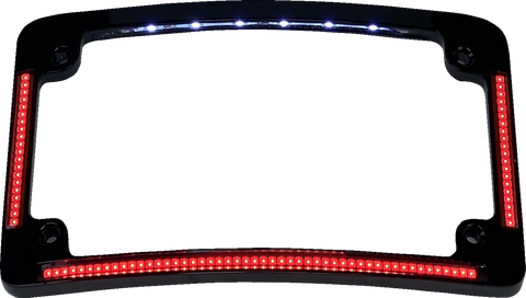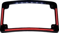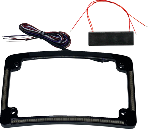 Three banks of auxiliary red LEDs and tag illumination, 20 red LEDs are flush mounted on either side, with a row of 50 dual intensity red LEDs flush mounted across the bottom. 6 white LEDs are embedded along the inside edge for tag illumination, All wires exit a single location on the back side of the frame, the 43* wires allow length for routing and connecting wires, Works with standard 4* x 7* motorcycle tags, Compatible with 12 V DC systems with a negative ground, Mounting hardware included