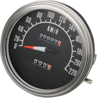 5" KPH FL-Style 2:1 Speedometer - '68-'84 Black Face Speedometers have 12mm thread, To install speed heads on 47-67 FL, use cable adapter PART #2210-0062 (sold separately), Mileage cannot be reset on speedometers.