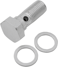 Banjo bolts designed for Drag Specialties universal brake lines, Made in the U.S.A., Meet DOT MVSS-106 specifications, Banjo bolts are chrome-plated steel and sold separately, 04-16 XL models use metric 10mm x 1.25" and 12mm x 1.50" banjo bolts, washers and fittings. All Big Twin (except 08-16 Dressers) and pre-04 XL models use standard 3/8" and 7/16" banjo bolts, washers and fittings. Fittings and washers listed as 3/8"/10mm can be used in either application.