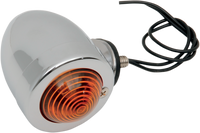 Bullet Light with Mount - Dual Filament - Amber Lens Red lights with right- and left-side chrome mounts, Dimensions: 3-1/4" L x 2-1/4" diameter, Not DOT or ECE compliant.
