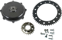 Converts stock belt drive to chain drive, Reuses existing cush drive isolator, Kit includes aluminum sprocket hub adapter plate/spacer/bearing assembly, 24 tooth front steel sprocket, 51 tooth steel rear sprocket and installation hardware