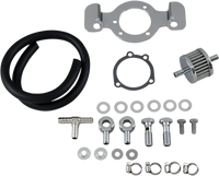 Kit allows the installation of aftermarket air cleaner assemblies on late model bikes equipped with OEM CV carb or Delphi EFI system, Includes bracket, filter, hose and all mounting hardware necessary for installation