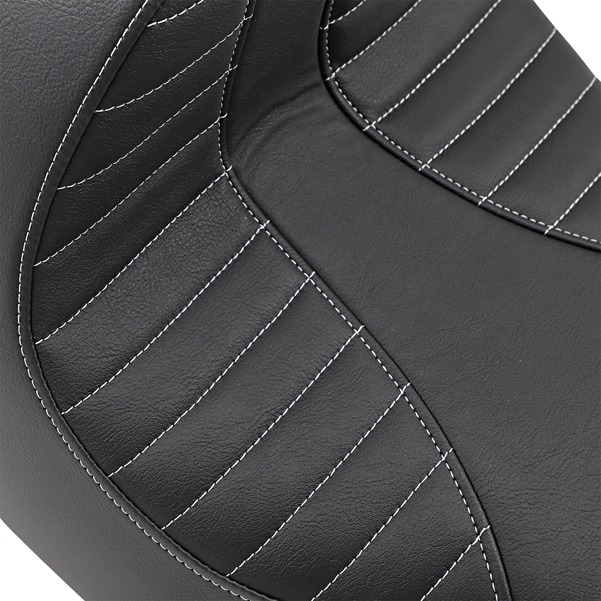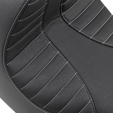 EZ mount system for user-friendly mounting; no tools needed for seat installation or removal, Seat covers the two seat fender studs for that low, clean look, Molded polyurethane foam interior for maximum comfort, 3/16" ABS thermoformed seat base for a perfect fit, Lowers rider up to 1" from stock seat depending on model, Include all mounting hardware, Made in the U.S.A.