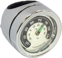 Handlebar Mount Thermometer - Chrome - For 1" Bar Chrome housing, 1" Clamp fits 7/8" and 1" diameter handlebars, includes all necessary mounting hardware, Uses SR626SW battery, Features black and silver face