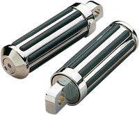 Another unique design from Drag and Arlen Ness, Protective rubber rails run completely around diameter for great looks no matter how pegs rotate or pivot, Each is precisely die-cast, chrome-plated aluminum, End cap is super-clean and uses a grade 8 countersunk flat-head socket screw, Very tight tolerances ensure a great-quality, super strong footpeg assembly, Carbon-steel pivot ends are stronger than other die-cast pivots, Peg diameter is 1-1/2" (between a standard large-size driver and the smaller passenger-style pegs); length is 4" without pivot end, Shifter peg matches footpegs